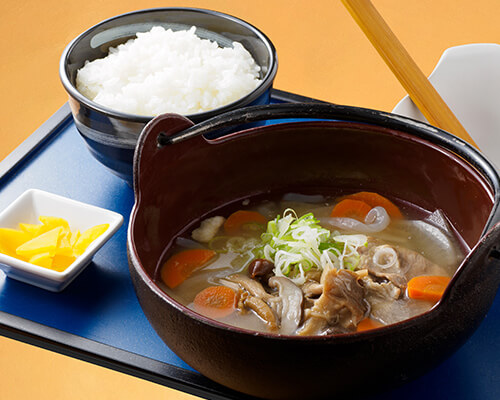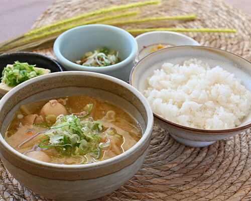 花巻特産「白金豚」を使用した、具だくさんで栄養満点の食べる豚汁と米どころ岩手の新米を合わせました。