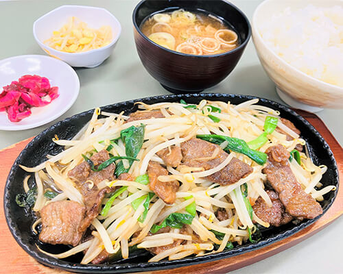 アツアツの鉄板に盛られた具材たっぷりのレバニラは、甘じょっぱいタレがレバーに染みてご飯がもりもり進む!