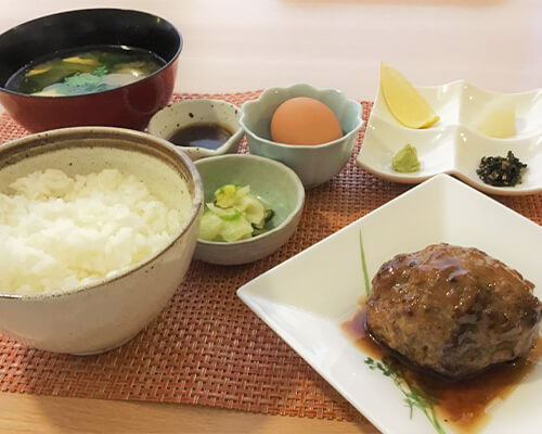 地元大崎市自慢の新米と仙台名物牛たんバーグのコラボ!薬味で色々な食べ方をお楽しみください。