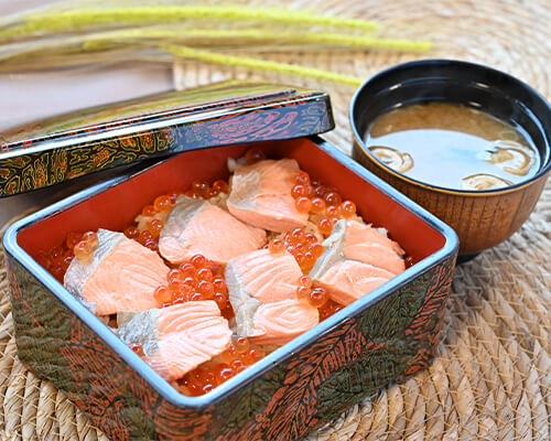 郷土料理『はらこ飯』。鮭の煮汁で炊き上げた新米に、ふっくら肉厚な鮭の身とイクラをのせました。