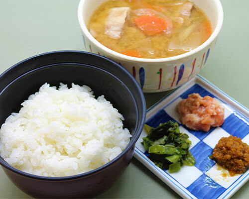 ほかほかごはんにあったか豚汁。3種類の付け合わせはどれもご飯がとまらなくなる一品です。
