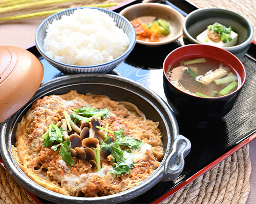 ふんわり卵で閉じたあつあつの煮込みカツはご飯との相性抜群!あだたら亭しそきくらげも一緒にどうぞ。