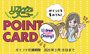 対象SA・PAで『SAFE Driving!!スタンプ』を5ポイントためると「リフレッシュメニュー」1品無料!!