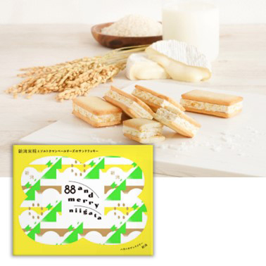 佐渡の塩、カマンベールチーズを使用したチーズチョコを、新潟県産の素材(米粉、牛乳、佐渡の塩)を使用したチーズクッキーでサンドした、まさに新潟づくしなサンドクッキーです。プレゼントにピッタリな専用紙袋付き。