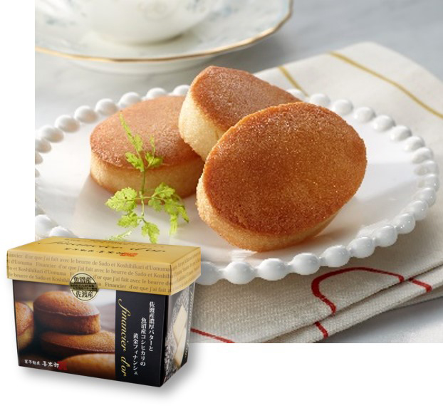 濃厚な味とコクを持つ佐渡産のバターと魚沼産コシヒカリの米粉を使った生地を焼き上げたフィナンシェ。上品な舌触りと芳醇な香りが特徴です。