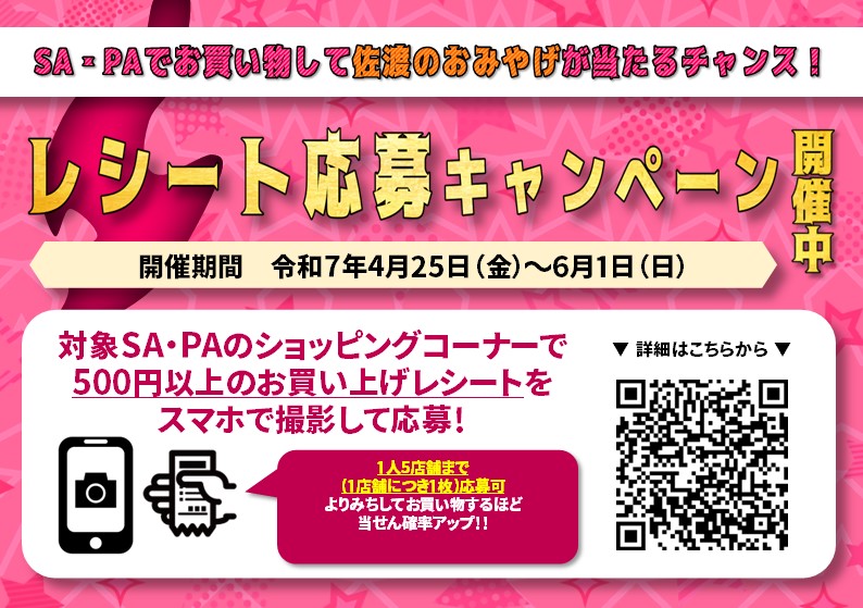 ・対象のSA・PAのショッピングコーナーで商品を購入したレシート(税込500円以上)を撮影して応募すると、抽選で佐渡関連のおみやげ詰め合わせが当たるレシートキャンペーンを実施いたします。