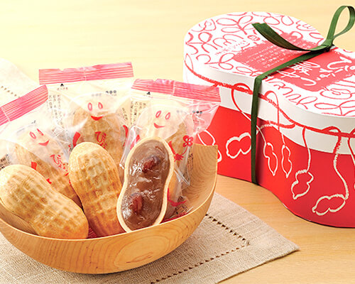 落花生の甘煮を煉りこんだ白餡を、愛らしい落花生の形の最中種に詰めました。