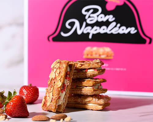 ホワイトチョコクリームとフリーズドライ苺をパイ生地でサンドしたミルフィーユ。