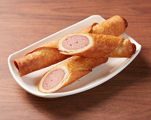 ソーセージをトルティーヤに包んで揚げたパリパリおやつ。
