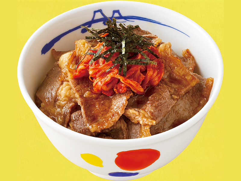 鉄板で焼き上げたジューシーでやわらかな牛カルビに、フルーティーなタレをかけてキムチと刻みのりをトッピング。一度食べたら癖になる松屋のロングセラー焼肉丼。