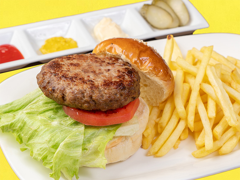 「短角牛」を使用したハンバーグは、脂肪が少なくやわらかな歯ごたえが特徴で、口いっぱいに旨味が広がる!さらにバンズも当SAベーカリーでつくりバーガーに仕上げました。