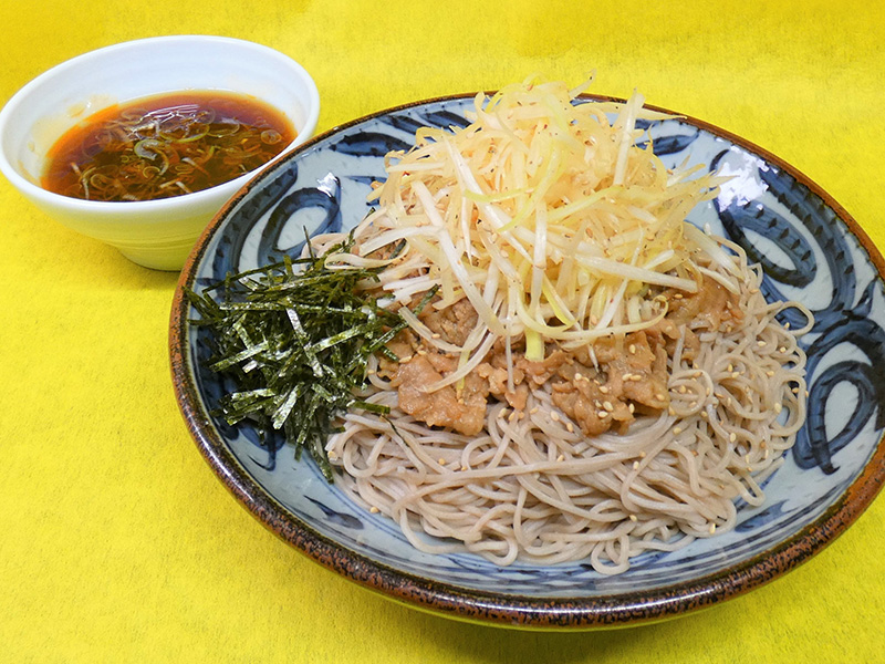 地元産「杜仲茶ポーク」を焼肉風に味付けし、たっぷりの白髪ネギをトッピングしたボリューム満点メニュー!つけ汁はラー油でピリ辛味にしているので食欲が進み夏前のスタミナメニューとしておすすめです。