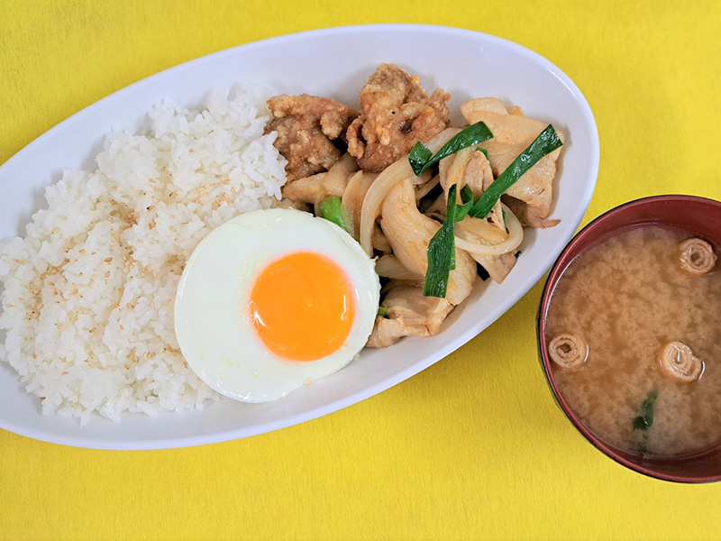 約300gのご飯に100gの豚バラ肉と玉ねぎ、ニラを炒めたニンニク風味のピリ辛焼肉。さらに約50gのから揚げが2個と目玉焼きがついたボリュームのある一品です。