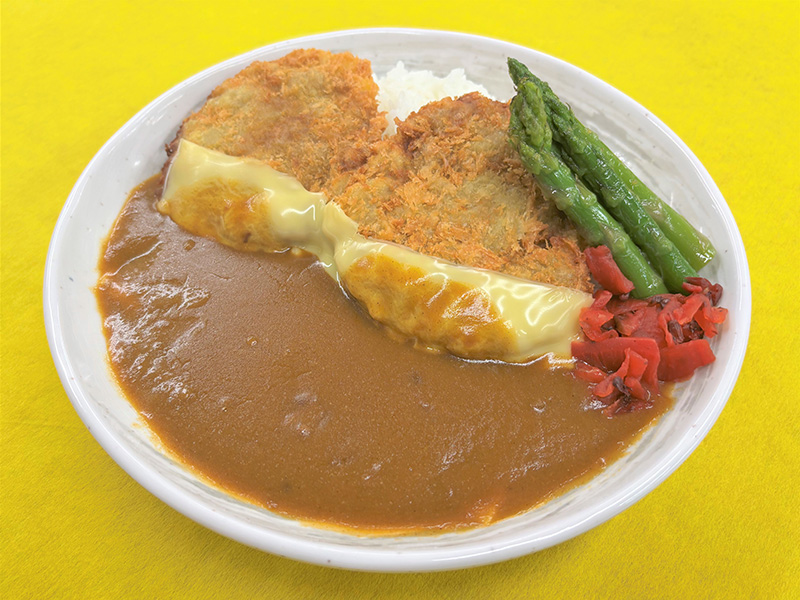 『白金豚と前沢牛のメンチカツ』をカレーライスに2個乗せ。白金豚多めな豚メインのメンチカツなので、ほろっと柔らかめ。さらにチーズをトッピングして美味さ、パワーも倍増。メンチカツとチーズ、そしてカレーの相性はそれぞれ抜群!