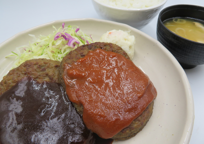カロリー満タン!2枚重ねた360gのハンバーグはボリュームたっぷり。味を変えて楽しめるよう王道のデミグラスソースと埼玉県東松山市の辛味噌をオリジナルで調合した辛味噌ソースの2種類をご用意。