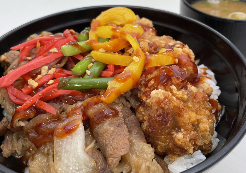 牛肉と鶏唐揚を甘辛いタレで仕上げました。フライドガーリックの香りが食欲をそそります!