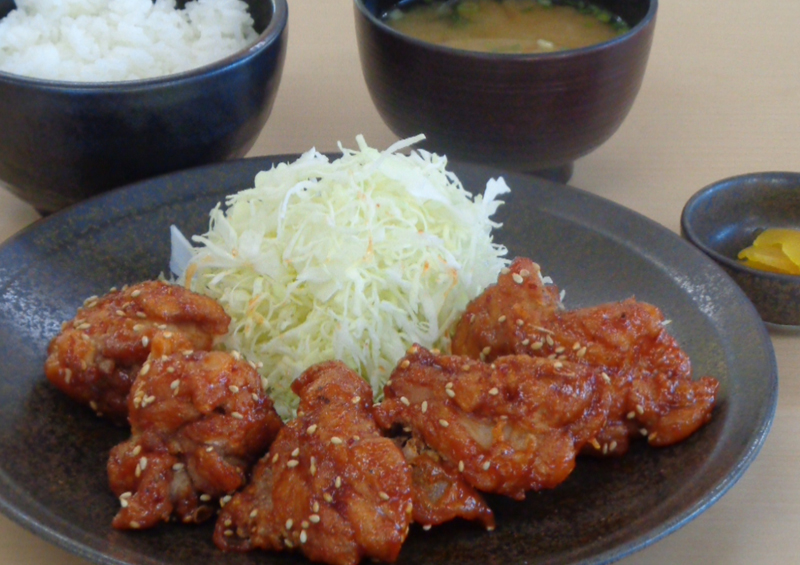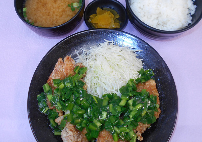 ニラはスタミナ野菜の代名詞!ジュ~シ~な揚げ鶏にゴマ油を効かせた当店特製にらダレをたっぷりと!!にらダレだけでもごはんが進む~~♪食べるにらダレ♪ボリューム満点の揚げ鶏のにら塩ダレかけ定食を食べてスタミナチャージ!!