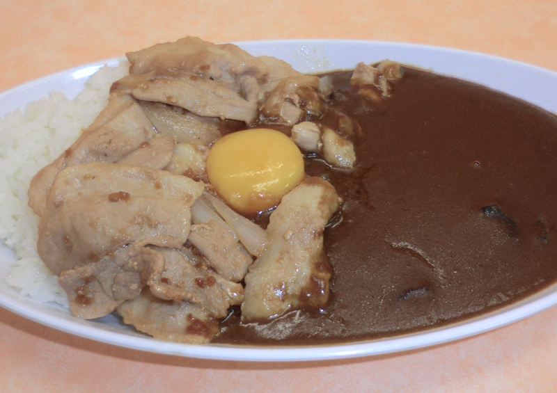 大盛のライス、大盛のカレーに加えて生姜焼き肉120gと卵黄を乗せた贅沢なスタミナ感あふれるカレーです。一度食べたらヤミツキになります。
