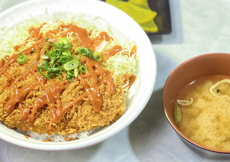 地元 東松山名物「辛味噌」を使用したご当地カツ丼です。様々なスパイスが入った辛味噌は、ただ辛いだけではないコクの深い味わいが特徴。にんにくの香ばしい香りがふわっと鼻を通り食欲をかきたてる、夏にオススメのメニューです。