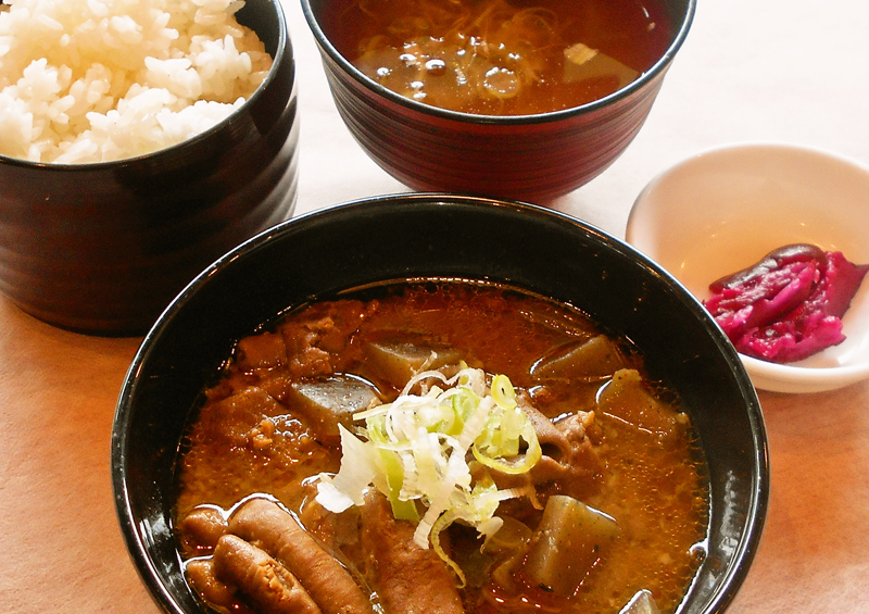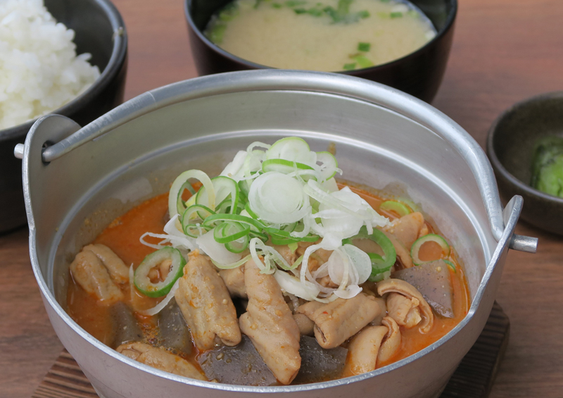 群馬県のソウルフードである『もつ煮』を定食にしました。豚モツを地元昭和村で作られたこんにゃくと煮込み、味噌味に仕上げた一品です。
