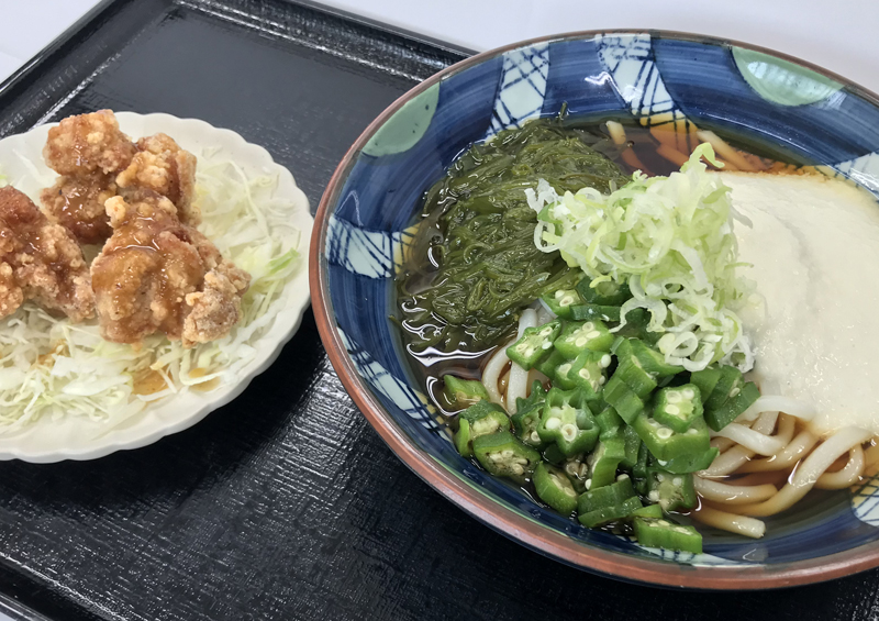 とろろ・めかぶ・オクラをふんだんに使用した冷やしねばとろそば(うどん)と、特製にんにくソースが効いた鶏のから揚げセットです。夏バテ気味の方にぜひおすすめしたい、スタミナ満点メニュー!