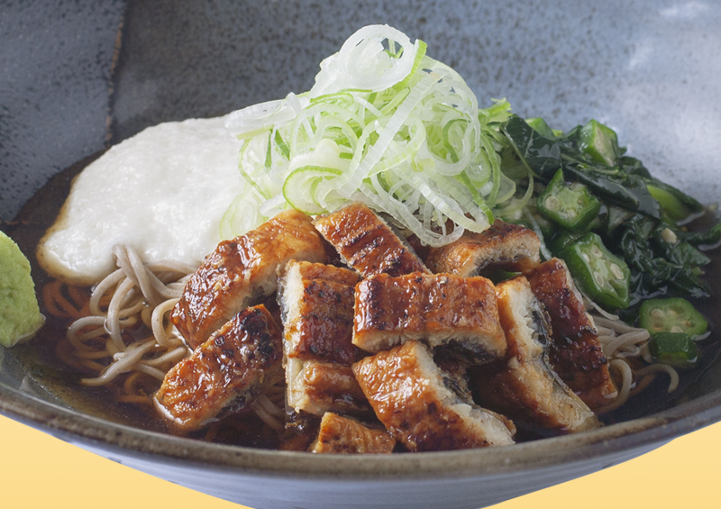 スタミナ回復効果があると言われている鰻、とろろ、モロヘイヤと、暑い時期でも召し上がりやすい冷たくのど越しの良いとろろそば!夏バテ対策におすすめのメニューです。