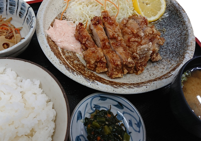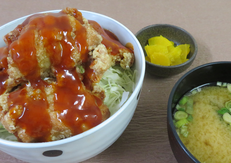 から揚げの上にたっぷりのオニオンスライスをのせ、信州上田名物の美味だれで仕上げた、ガッツリメニュー。ごはんがとまらない!