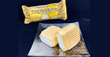 新潟県産こしひかりの米粒入り、もなかの皮はしっとりとコクのあるバニラアイス。ゆっくり食べていると米のつぶつぶが感じられる。