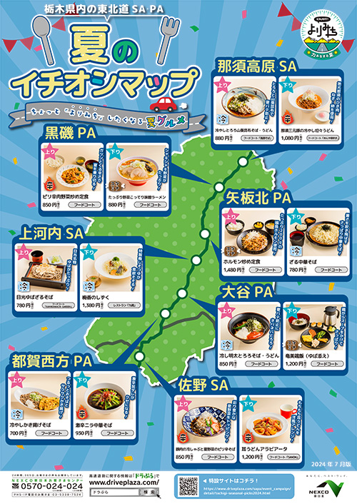 栃木県内の東北道のSA・PAからちょっと「よりみち」したくなる夏グルメをご紹介。冷やし・辛味・スタミナメニューを取り揃えておりますので、お立ち寄りの際は各店イチオシの夏グルメを是非ご賞味ください!