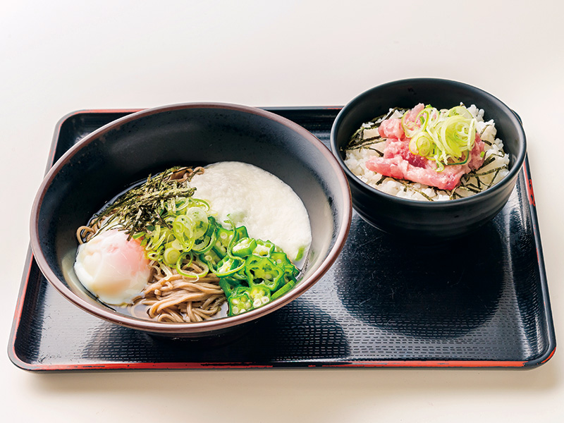 暑い日は、やっぱり冷たいおそば!とろろ・オクラのねばねばと温泉卵でつるると食欲そそる一品。みんな大好きミニねぎとろ丼付き☆