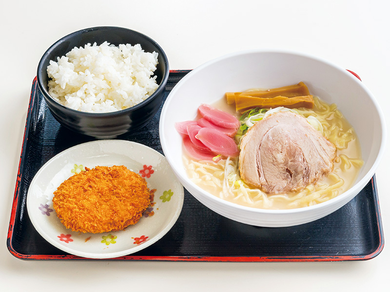スープとトッピングに岩下の新生姜を使用したラーメンに、これまた岩下の新生姜の入ったメンチカツを合わせたメニュー。ライスもついてます。