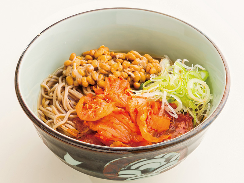 相性ピッタリの「キムチ」と「納豆」をそばに乗せた、夏におすすめな冷たいぶっかけのそばです。(うどんもあります)