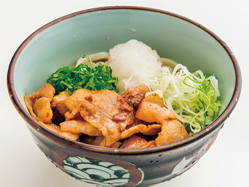 冷たいうどんに甘タレで炒めた豚バラがトッピング!大葉と大根おろしで絡めて召し上がりください!(そばもあります)