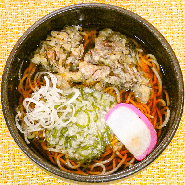 野菜のほかにイカ・えびも入った、見た目もびっくりな大ボリュームのかき揚げをトッピング!天そばと侮るなかれ、おなか一杯メニューです。