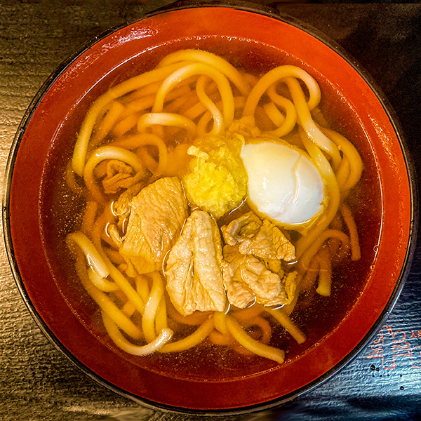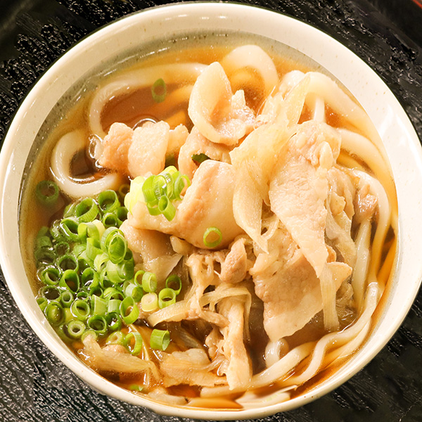 かけうどんに味付けした豚肉&たっぷりの生姜・温玉をトッピング。生姜の香りを楽しみながら、体の内側からじんわり温まってください!