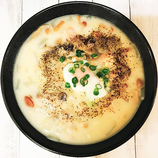 白石市の名物『うーめん』に、小エビ、きのこ、ベーコンが入ったアツアツのクリームシチューをたっぷりかけました。寒い季節にピッタリ!