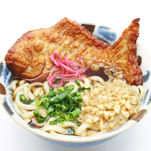 器から飛び出るほどの鯛蒲鉾が丸ごと1枚入ったうどん。多くの人が巨大さにびっくり!縁起の良さそうなネーミングで験を担いでみては?