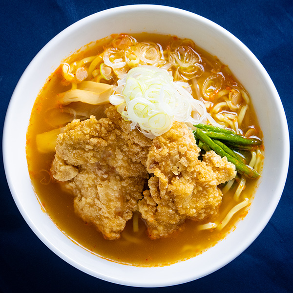 寒い冬にからだの芯からあたたまる辛味噌とチャーシューの代わりにボリュームたっぷりの鶏立田揚げを2つもトッピングした贅沢なラーメン。