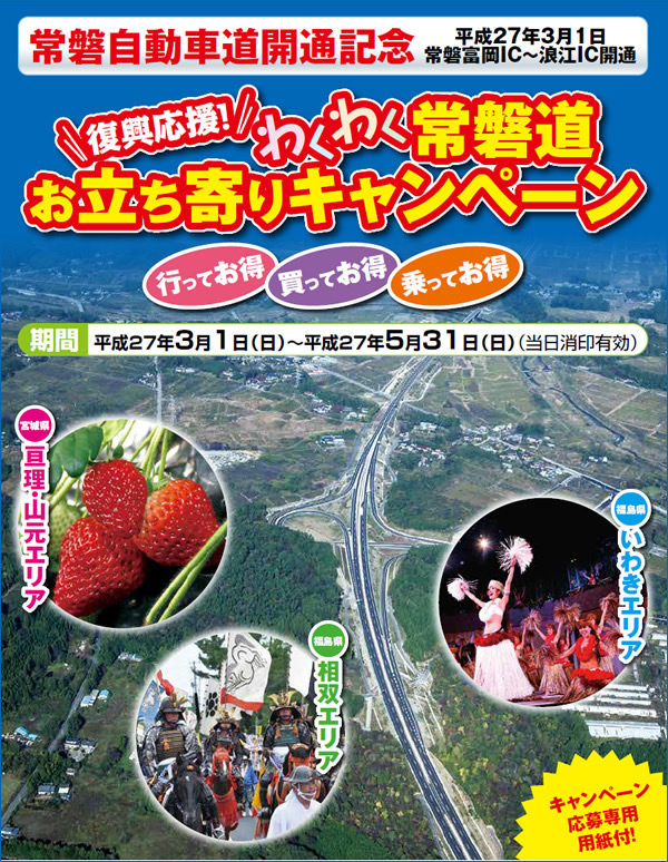 2015年3月1日の常磐自動車道の全線開通を記念して、常磐自動車道を使って沿線地域を楽しんで頂くために「わくわく常磐道 お立ち寄りキャンペーン」を実施いたします。
