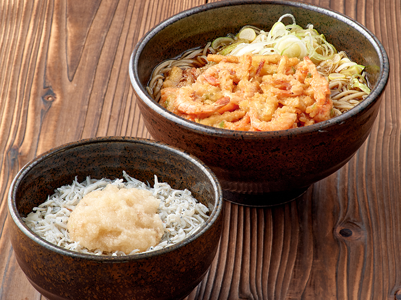 旬の釜揚げしらすに梅おろしをのせたご飯と人気の海老入りかき揚げの手打ちそばをセットにしました。