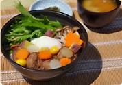 今話題のヘルシーな「ダチョウ肉」の特徴を生かすために豆腐と合わせて食べやすいつくねにして、丼ぶりにしました。 自家製照り焼きソースがマッチした野菜もたっぷりのメニューです。