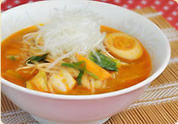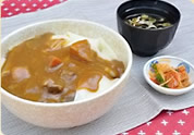 見た目はカレーうどん?、しかも幅広なひもかわうどん! カレーとうどん、そしてご飯が一つになったどこか懐かしいボリューム満点丼ぶりです。 中に隠れている○○○がトローリとろけてより一層おいしくなってます。 スプーンでひもかわうどんを切りながらカレーとごはんと一緒にお召し上がりください。
