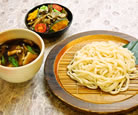 1,100円地元吉岡町産の百日舞茸に平茸、しめじ、なめこ、なら茸、木耳と県内産豚バラ肉の入った温かいつけ汁で、水沢うどんをお召し上がり下さい。サラダにもしめじを使用したきのこづくしの一品です。