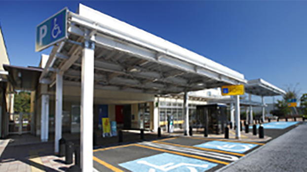お身体の不自由な方等のために、駐車場内を横断することなく安全にご利用いただける障がい者等用駐車スペースを設置しております。