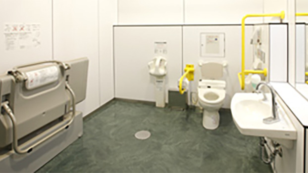 障がい者等用トイレ(バリアフリートイレ)やオストメイト対応トイレのほか、子供トイレ、ベビーベッドなどトイレ内設備の設置状況をご覧いただけます。