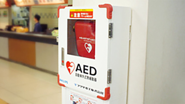 AEDは突然心停止状態に陥ったときに装着して用いる救命装置です。訓練を受けたスタッフだけでなく、お近くのお客さまなど誰でも利用することができます。