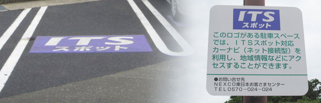 「ITSスポット」のロゴがある駐車スペースでは、ITSスポット対応カーナビ(ネット接続型)を利用し、地域情報などにアクセスすることができます。