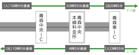 - 上り線の場合:青森中央本線料金所の通過時刻が、割引適用時刻を過ぎているため割引が適用されません。