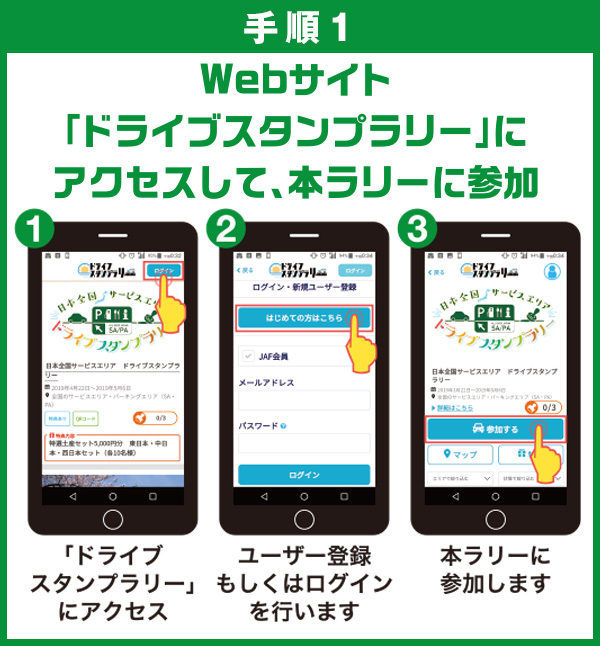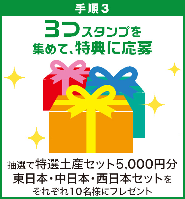 WEBサイト「ドライブスタンプラリー」にユーザー登録、またはログインを行い、『日本全国サービスエリア ドライブスタンプラリー』に参加してください。対象SA・PAより3つ以上スタンプを集め、特典にご応募いただいた方の中から抽選で『特選土産セット5,000円分 東日本・中日本・西日本セット』をそれぞれ10名様に進呈いたします。