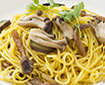 きのこ好き集合! 本格生パスタを使用し、地元で採れた秋なす、きのことともに和風しょうゆ味で秋の味穫をお召し上がりくださいませ。